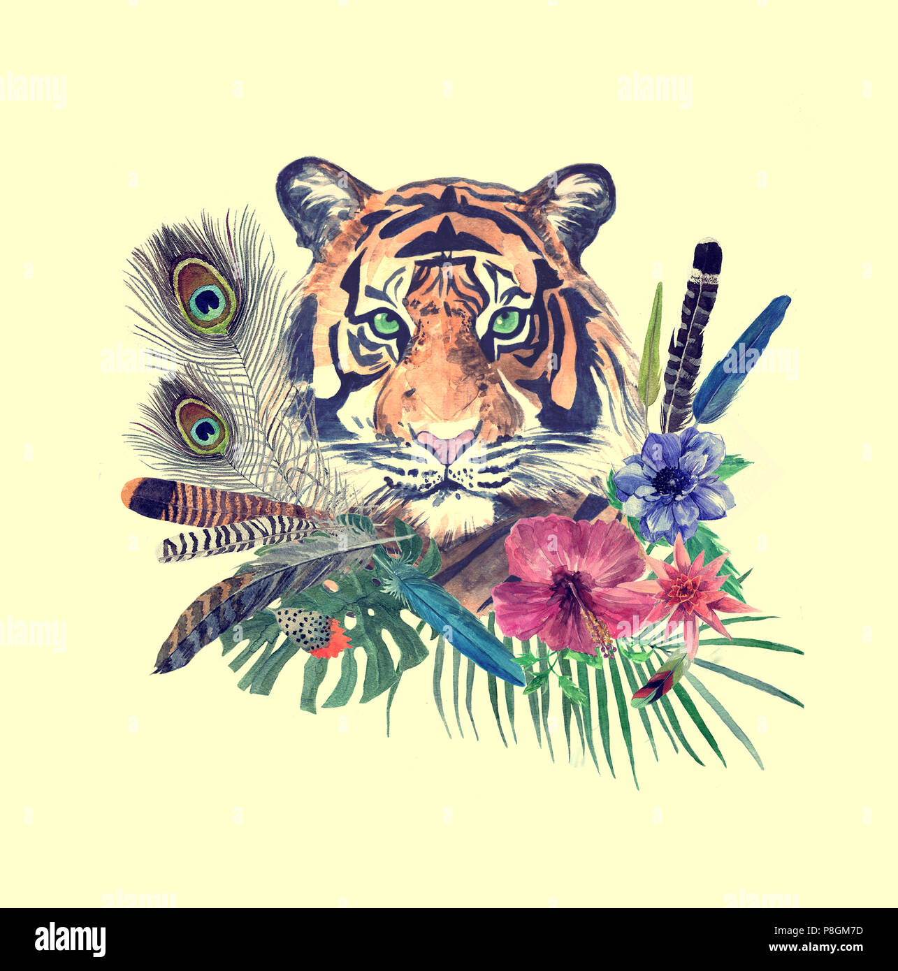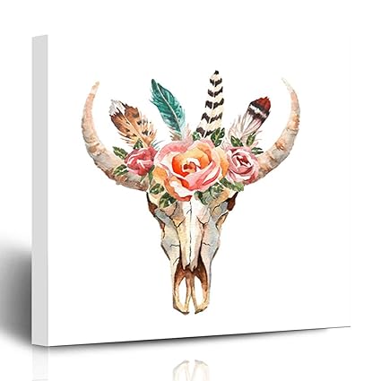 Watercolor Isolated Bull S Head With Flowers And Feathers On White